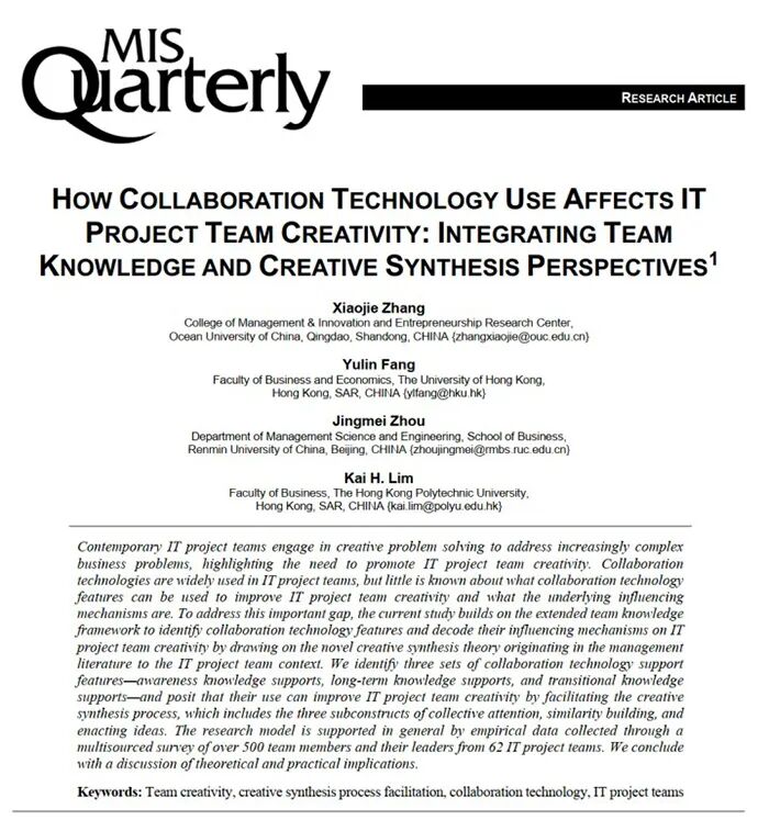 近日,中国海洋大学管理学院青年教师张晓洁博士(第一作者)与香港大学经管学院方钰麟教授、中国人民大学商学院周京梅副教授、香港理工大学学院林开教授合作完成的研究成果“How Collaboration Technology Use Affects IT Project Team Creativity: Integrating Team Knowledge and Creative Synthesis Perspectives”(协作性技术的使用如何影响IT项目团队的创造力:基于团队知识和创造性整合的视角)在管理学国际顶级期刊MIS Quarterly(UTD24)在线发表。这是学校首次在该期刊发表研究成果。