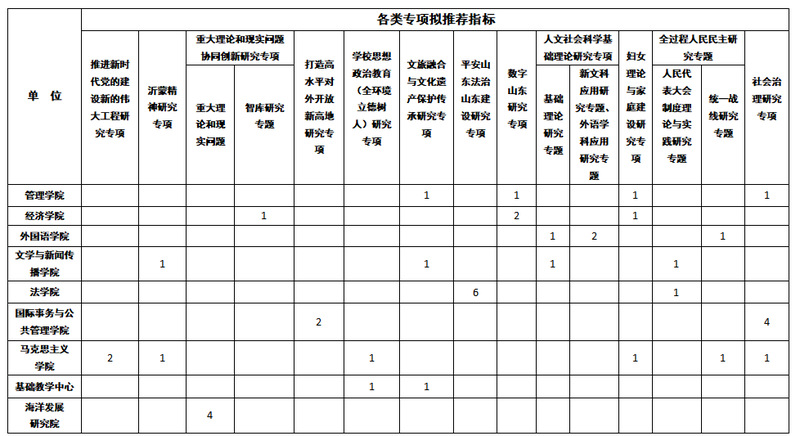 1.10月21日12时前,各单位由科研秘书将《2025年度山东省社会科学规划研究专项申报意向统计表》(附件4)电子版发送至文科处邮箱:songsusu@ouc.edu.cn。文科处将于10月21日17时前反馈审核意见,各单位确认后可通知相关老师提交后续申报材料。