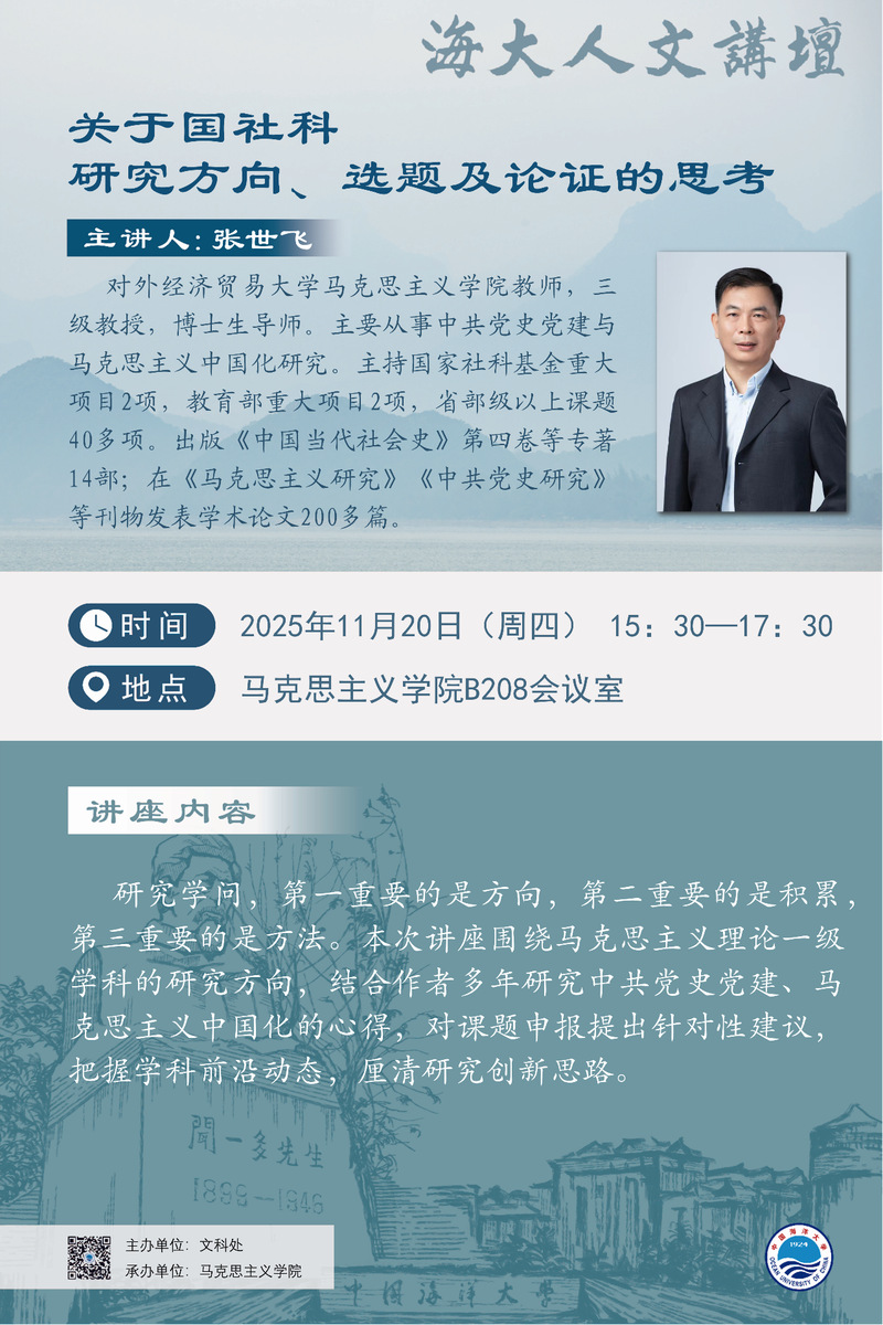 海大人文讲坛2025年第87讲—张世飞 | 关于国社科研究方向、选题及论证的思考