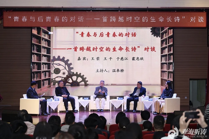 22日下午,《王干青春诗抄》《缘山路11号》新书发布会暨“青春与后青春的对话——一首跨越时空的生命长诗”对谈在崂山校区文学与新闻传播学院乐海堂举行。王蒙先生、林滨先生共同为新书揭幕。作者王干、霰忠欣分别向文学与新闻传播学院赠书。王蒙、王干、于慈江、霰忠欣四位嘉宾围绕诗歌与青春、王蒙先生诗歌创作等展开深度对谈。活动最后,王蒙先生与全体师生深情朗诵了《青春万岁》序诗。