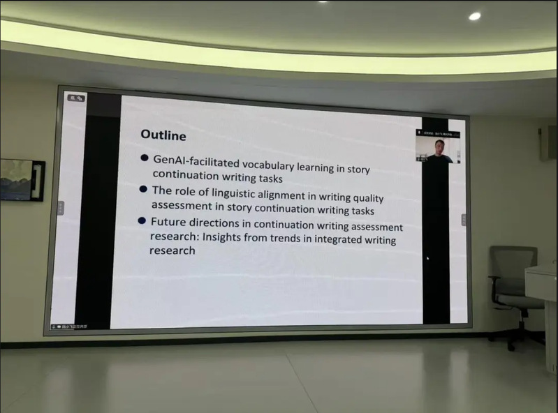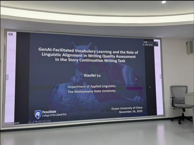 11月24日上午,中国海洋大学外国语学院举办“生成式人工智能辅助的词汇学习与语言协同在读后续写任务写作质量评估中的作用”学术沙龙。本次沙龙特邀中国海洋大学特聘教授、美国宾夕法尼亚州立大学博士生导师陆小飞教授担任主讲,由外国语学院陈颖教授主持。
