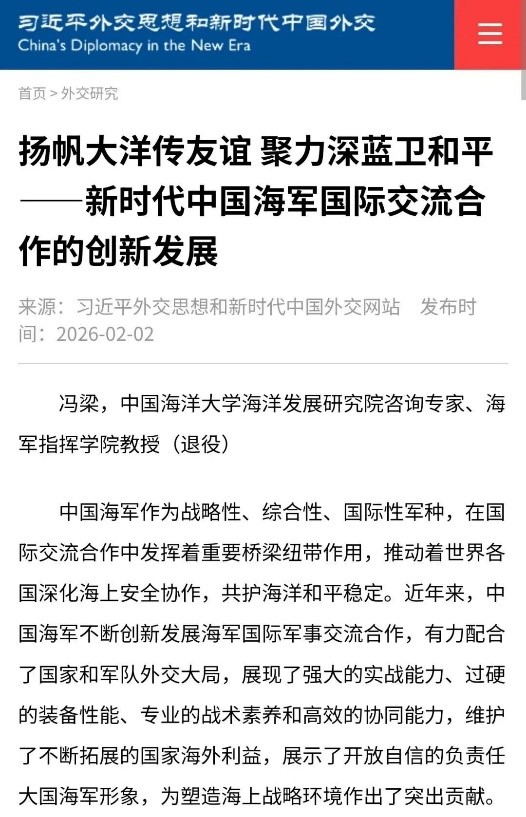 2月2日,中国海洋大学海洋发展研究院冯梁教授应“习近平外交思想研究中心”邀请撰写的“扬帆大洋传友谊 聚力深蓝卫和平”,登载于中宣部和外交部指导、全面系统宣介习近平外交思想的权威官方平台“习近平外交思想和新时代中国外交网站”。