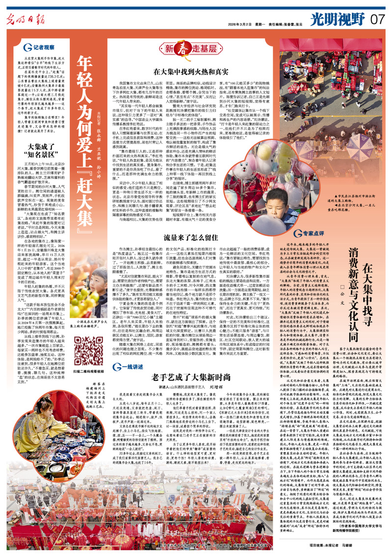 3月2日出版的《光明日报》在第7版“光明视野”对“年轻人为何爱上赶大集”这一文化现象进行了专题报道,并刊发中国海洋大学文学与新闻传播学院公文教授撰写的题为《在大集中找寻消费新意与文化认同》的理论文章。