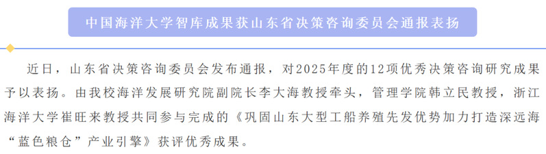 近日,山东省决策咨询委员会发布通报,对2025年度的12项优秀决策咨询研究成果予以表扬。由学校海洋发展研究院副院长李大海教授牵头,管理学院韩立民教授,浙江海洋大学崔旺来教授共同参与完成的《巩固山东大型工船养殖先发优势加力打造深远海“蓝色粮仓”产业引擎》获评优秀成果。