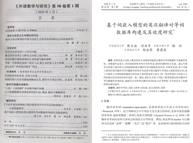 近日,中国海洋大学语言大数据研究团队在国内外语类顶刊《外语教学与研究》2026年第1期(第58卷第1期)发表论文《基于词嵌入模型的英汉翻译对等词数据库构建及其效度研究》。论文作者为中国海洋大学陈士法、刘羽丰、郑冰寒、李潇辰,以及西南交通大学杨仪。