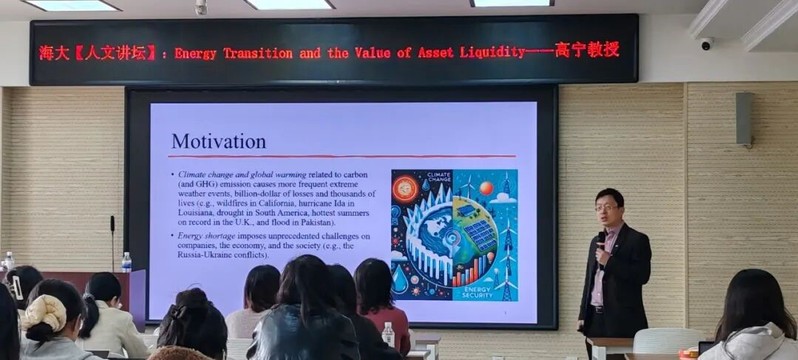 3月25日,英国曼彻斯特大学商学院高宁教授应邀做客“海大人文讲坛”,在管理学院作题为“能源转型与资产流动性的价值”的专题讲座,由管理学院会计系主任房巧玲教授主持。高宁从全球气候危机切入,聚焦美国可再生能源组合标准(RPS)政策,剖析其通过推高电价及波动性增加企业成本与风险,进而提升现金持有价值的传导机制,结合实证指出政策对特定企业的显著影响。