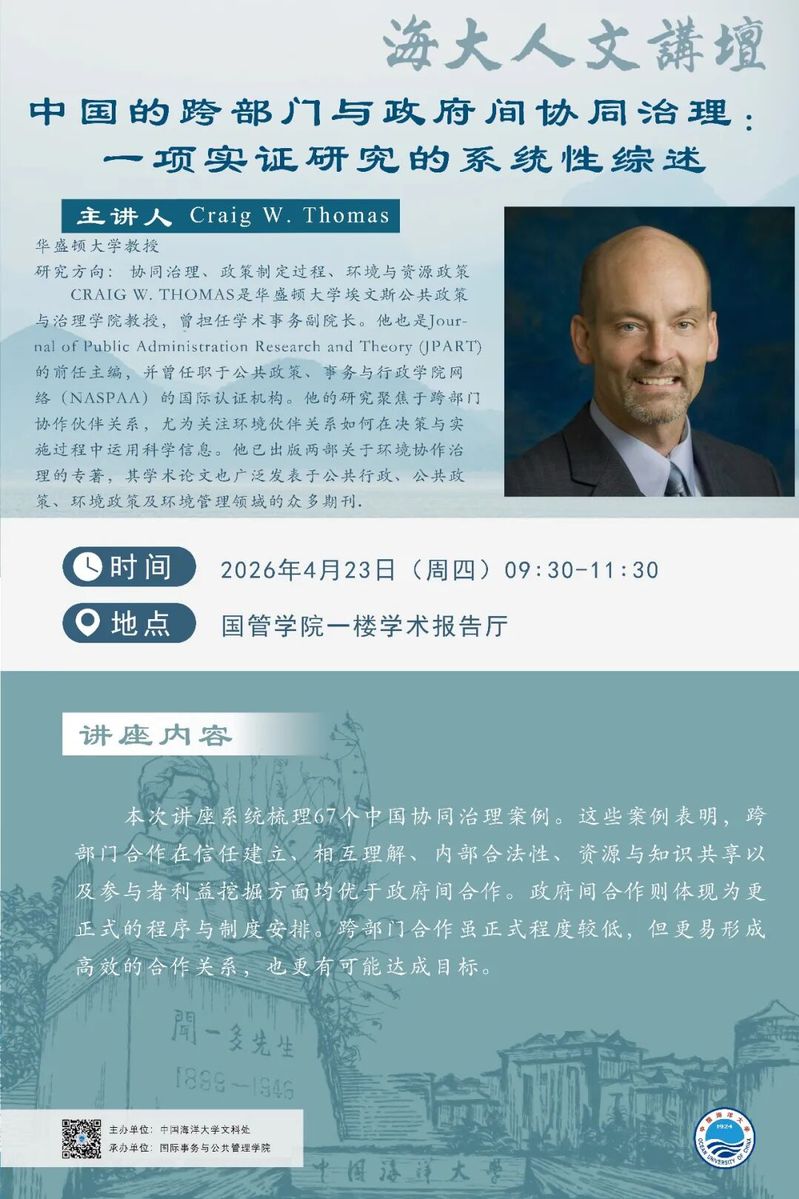 海大人文讲坛2026年第9讲—Craig W.Thomas|中国的跨部门与政府间协同治理:一项实证研究的系统性综述
