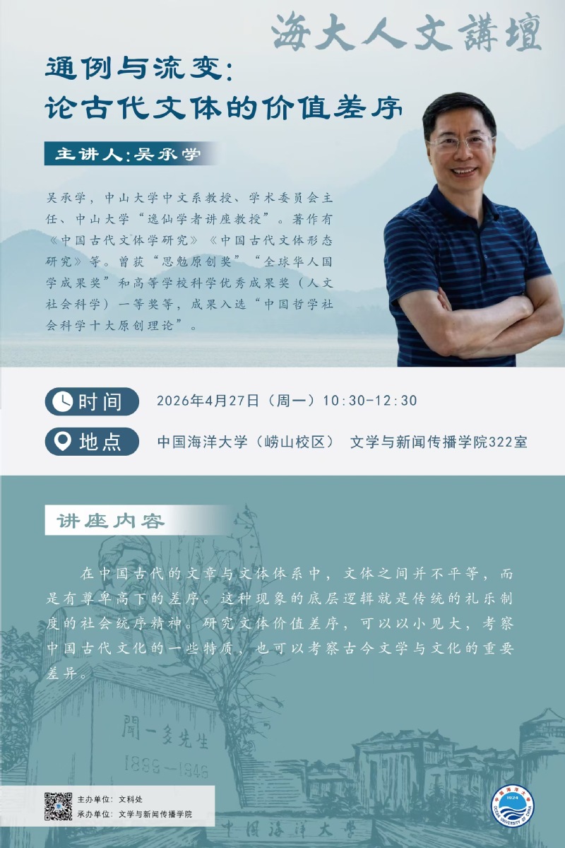 海大人文讲坛2026年第11讲—吴承学 | 通例与流变:论古代文体的价值差序