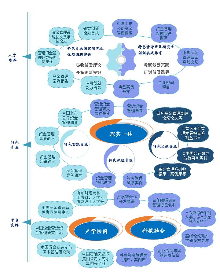 本成果以山东省首个会计学博士点、首个会计硕士(MPAcc)授权点——中国海洋大学会计学科为支撑,通过山东省研究生教育创新计划“学术型硕士研究生实践能力的定位与培养模式研究”“全日制会计硕士专业学位(MPAcc)研究生培养模式创新研究”“营运资金管理研究优质课程”“营运资金管理案例库”等十几项研究生教育创新计划项目,系统论证了财会专业学术学位和专业学位研究生的能力框架。在此基础上,以中国会计学会与中国海洋大学合作设立的中国企业营运资金管理研究中心为核心并联合包括本成果主要完成单位的40多家协同单位,通过组织产学研协同创新和大规模的企业资金管理调查,解决由于资金管理研究与实践严重脱节导致的教育资源陈旧落后问题;科教融合,以资金管理“思想库”“文献库”“数据库”“案例库”建设为核心,强化教育资源的系统整合,解决资金管理教育资源高度分散问题和理论创新能力与实践创新能力培养的脱节问题,将研究生理论创新能力和实践创新能力的培养融为一体;产学协同,以面向学术前沿的学术高地和面向重大现实需求的权威智库建设为牵引,以“共研”“共建”“共享”“共赢”的理念,增强协同各方的合作动力和协同的持续性。