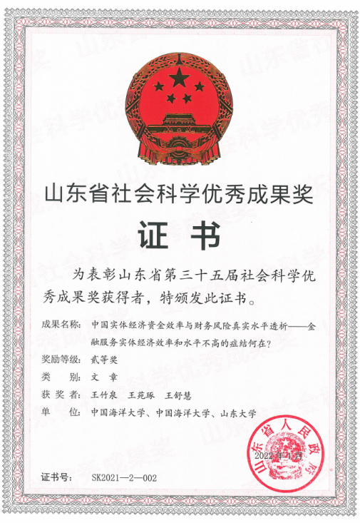 2.王竹泉等《中国实体经济资金效率与财务风险真实水平透析金融服务实体经济效率和水平不高的症结何在?》发表于《管理世界》2019年第2期,获山东省第三十五届社科优秀成果二等奖