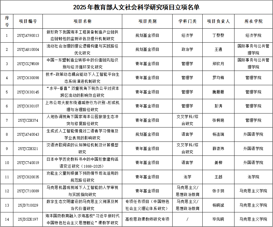 中国海洋大学获批14项2025年教育部人文社会科学研究项目
