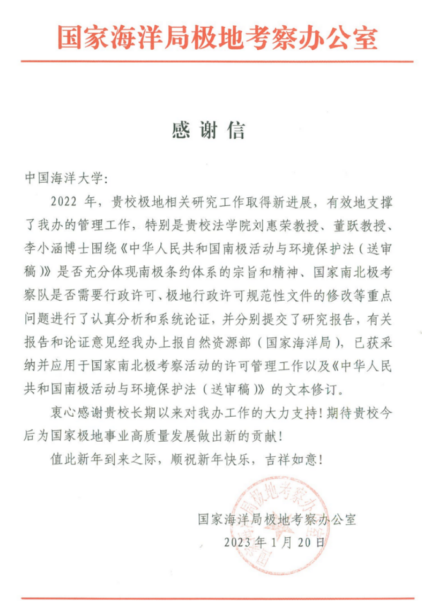 最主要的合作伙伴就是国家海洋局极地考察办公室,双方已经保持了近20年的合作关系。近年来,我们配合极地办完成了以下重要工作:(1)极地事业发展“十四五”规划中制度建设及国际合作部分的撰写。(2)系列南极立法研拟工作。(3)机构调整后,极地事务相关规范性文件的整理及修订工作。(4)对参与南极海洋生物资源养护公约委员会会议的支撑工作;担任《南极海洋生物资源养护公约》第40届缔约方大会(CCAMLR-40)和南极条约协商会议(ATCM-44)中国代表团成员,参与谈判和提供咨询。参与南极环境保护委员会会间工作组,撰写《落实应对气候变化工作计划》英文工作文件,经自然资源部和外交部会商同意,由中国外交代表团向ATCM44(第44届南极条约协商会议)全文提交该文件。“在会议讨论中,该文件推动了会议同意切实落实现有《应对气候变化工作计划》,有力促进了我方立场主张转变为会议决定”。(5)对于一些重大战略事件对于极地事务影响的专题分析,例如乌克兰危机、BBNJ谈判等;针对中国应对日本福岛核污染水排放提出法律策略建议,山东省委办公厅上报中办信息采用。(6)受托完成年度的专题课题研究,最近两年一共受托3个课题,合计60万经费。最近两年有关极地的14份咨政报告,有近半数是通过极地办呈报的,其中多份得到了时任自然资源部部长和副部长的肯定性批示。