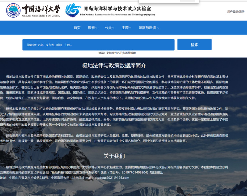 “极地法律与政策数据库”(Polar Law and Policy Database,PLPD)由中心发起建立,在2021年建成,目前已经正式运行。并获得刘惠荣教授主持的国家重点研发计划“极地科技与国际治理支撑体系研究”课题(项目号:2019YFC1408204)项目资助,主要提供极地国际法律与政治研究相关的各类官方文件。