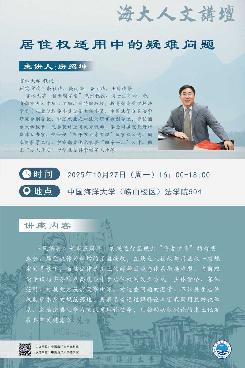 海大人文讲坛2025年第79讲—房绍坤丨居住权适用中的疑难问题