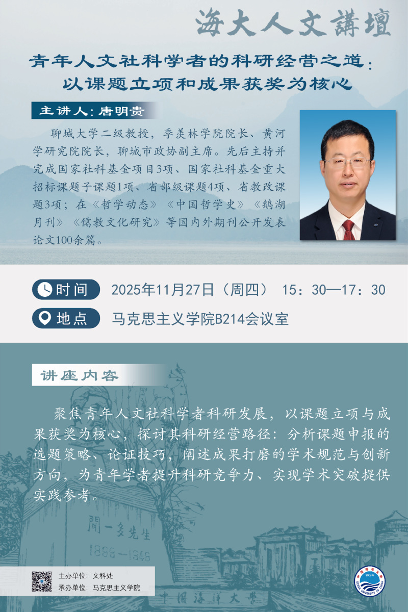 海大人文讲坛2025年第93讲—唐明贵|青年人文社科学者的科研经营之道:以课题立项和成果获奖为核心